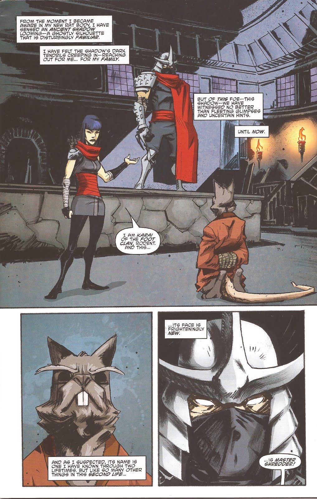 After defeating a giant Mouser, the Turtles find where Master Splinter was being held. Originally, this is when we met the Utrom. Splinter, being kidnapped by Karai, has been moved to a secret location and is face to face with Karai’s grandfather, Master Shredder. Karai was introduced long after Shredder’s death in the Mirage City at War story arc. We learn her name in issue 54 and she had no relation to Shredder. Shredder originally died in Mirage issue 1 and again in issue 21. It took until issue 9, plus 4 micro-series issues and 2 Infestation issues, for IDW to introduce Shredder. I like that we will have Shredder around for quite some time as the main villain in this series. Bringing him back for the Return to New York story arc was always a little weird; piecing together his body parts with some type of worm. Read it for yourself in the Ultimate Collection Volume 3 released in August 2012. Karai also warns of a war coming like the French ninja did in issue #6. We will be seeing the French ninja in Kevin Eastman’s TMNT Annual 2012 which will be released in October 2012.